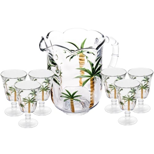 Super descontraído, o conjunto trás uma decoração de coqueiros em sua base, o que garante um charme pra lá de especial a esse conjunto.Ideal para seus momentos de diversão em casa, de fácil composição com qualquer louça.