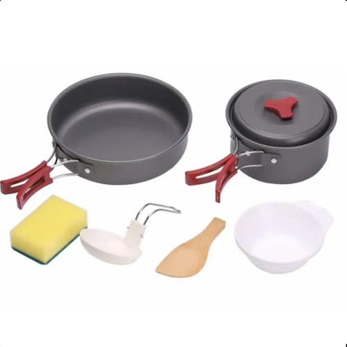 Características gerais: - conjunto de 7 peças para preparar e desfrutar de refeições ao ar livre. - acompanha sacola de transporte para conveniência. - feito com alumínio, aço inoxidável e bakelite para durabilidade. - facilidade de transporte. - revestimento em pó de alta temperatura para acabamento resistente. - 1 frigideira: 150x35mm - 500ml - 1 panela: 153x83mm - 900ml - 1 colher de sopa: 82x20mm - 1 pegador: 123x50mm - 1 esponja: 85x58x29mm - 2 tigelas plásticas: 128x110x38mm