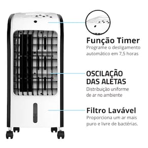 *Recursos Adicionais: Timer (até 7,5h), Modo Oscilação, Indicador de nível de água, Rodízios para transporte, Alça.