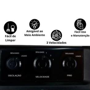 Características: Ciclo de ar: Frio Painel: Manual Funções: Resfria, umidifica e ventila Timer: Não Velocidades: 3 velocidades Dispenser de água: Sim Controle remoto: Não Direcionadores de ar: Sim Rodízios: Sim Alça de transporte: Não Potência: 110V: 230W / 220V: 190W
