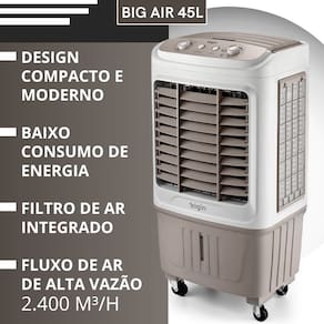 Especificações técnicas: - Potência: 107W - Reservatório de água: 45 litros - Autonomia: 25 horas - 3 níveis de ventilação - Compartimento para Gelo - Design compacto e moderno - 4 Rodas deslizantes com trava - Timer até 2 horas - Compartimento para Gelo: Sim - Painel Eletrônico: Não - Indicação de Nível: Sim - Air Swing: Sim - Vazão de Ar: 2400 m3/h