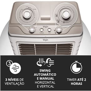 Especificações técnicas: - Reservatório de água: 65 litros - Potência: 182W - Autonomia: 30 horas - 3 níveis de ventilação - Compartimento para Gelo - Design compacto e moderno - 4 Rodas deslizantes com trava - Timer até 2 horas - Compartimento para Gelo: Sim - Painel Eletrônico: Não - Indicação de Nível: Sim - Air Swing: Sim - Vazão de Ar: 3500 m3/h