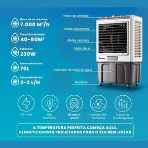 Modelo: SM-CP70L220V Área de cobertura: 40-80m² Fluxo de ar: 7.000 m³/h Dimensões e Peso: Altura: 115 cm Largura: 60,5 cm Profundidade: 40cm Peso Liquido: 15,5 kg Peso Bruto: 18,5 Kg Potência: 230W Tensão: 220V / 60 HZ Reservatório de Água Capacidade: 70 litros Indicador de nível de água: Sim Consumo Litro/Hora: 2-3 L/h Qtde. Frasco de Gel Refrigerante 2 Unidades Modos de operação: Resfriamento, Ventilação, Swing Controle de velocidades: 3 níveis (Baixo, Médio, Alto) Painel de controle: Manual Garantia: 3 Meses Tamanho Caixa Master (mm): 650x420x1120 Benefícios: Redução de temperatura sem ressecar o ar Consumo energético até 90% menor em comparação ao ar-condicionado Fácil manutenção e limpeza