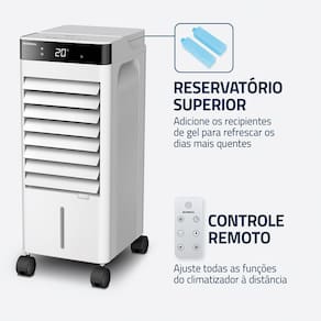 Reservatório Superior: Permite adicionar água e gelo de forma simples e rápida para turbinar a climatização nos dias mais quentes. Acompanha 2 recipientes com gel para um resfriamento ainda mais eficiente.