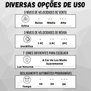 Especificações: - Potência: 10w - Capacidade do tanque de água: 600 ml - Velocidade do vento: 3 modos Alto/Médio/Baixo - Ruído: Menos de 42dB A - Tempo de pulverização: Até 12 horas - Tensão: 5V-2A - Peso: 726g sem água