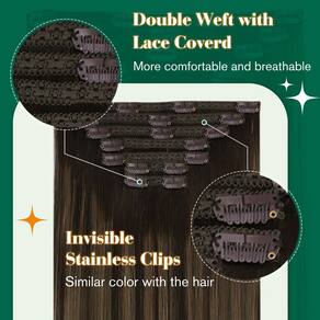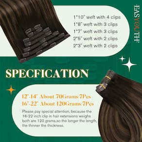 Extensões de cabelo Easyouth Clip in Hair Real Human Hair: As extensões de cabelo Easyouth Clip in Hair são feitas de cabelo 100% humano real. Adotamos tecnologia anti-queda para evitar que as extensões de cabelo caiam e se enrolem. Como aplicar extensões de cabelo com clipe: 1. Comece na parte inferior da sua cabeça na área da nuca, segmente uma seção do seu cabelo e use clipes de corte disponíveis aqui para separar o cabelo e cortar o cabelo. Os clipes são apoiados em silicone para maior aderência que pode proteger seu cabelo. 2. Faça isso novamente, seccionando seu cabelo cerca de 2,5 cm acima do último. 3. Aplique os pequenos pedaços em cada lado da sua cabeça, com clipes para serem colocados em cada lado da sua cabeça para equilibrar quaisquer camadas que você tenha em seu cabelo natural. 4. Use ferramentas de modelagem térmica em configurações baixas a médias e sempre use uma proteção contra o calor antes de alisar ou enrolar. Como cuidar do clipe nas extensões: 1. Escove suavemente com um pente de dentes largos ou uma escova de cerdas macias e vá de baixo para cima para remover quaisquer nós duros sem arrancar o cabelo. Depois, coloque suas tramas umas sobre as outras em um pacote para garantir que elas não se enrosquem com os clipes. 2. Aplique xampu nas extensões de cabelo. Segure a trama na parte superior, mergulhe-a na água e lave suavemente o cabelo com traços leves. Evite que eles se enrosquem e manuseie-os suavemente. Coloque cada trama cuidadosamente em uma toalha e repita o processo para cada trama. 3. Certifique-se de que eles permaneçam macios e hidratados aplicando uma máscara de cabelo ou condicionador profundo em cada trama de cima a baixo. 4. Enxágue cada trama e certifique-se de que não haja sensação escorregadia e macia após o condicionamento. 5. Depois de enxaguar as extensões de cabelo, esprema o excesso de água. Nunca esfregue com uma toalha para evitar emaranhados ou danos. Deixe secar ao ar livre e use uma toalha de microfibra de qualidade. - Material: Extensões de cabelo humano Easyouth feitas de cabelo humano Remy, pode ser enrolado ou alisado como cabelo natural, mas observe que não deve exceder 180 °C ao aquecer - Vantagens: com um design de renda, essas extensões são leves e respiráveis. O design dos clipes combina perfeitamente com a cor nas raízes do cabelo, criando uma mistura impecável, mais fácil de usar e tirar - Especificação: o grampo de cabelo humano em extensões contém 12 a 22 polegadas com um peso de 5 peças/70 g; 7 peças/120 g. Esta variedade permite que você encontre o comprimento e o volume ideais para qualquer penteado - Fácil e rápido de usar: você pode usar extensões de cabelo humano real por conta própria dentro de alguns minutos, e não há necessidade de contratar um cabeleireiro profissional para ajuda; até mesmo iniciantes podem aplicar facilmente as extensões de cabelo - : as extensões de cabelo Easyouth contêm , podem ser escolhidas de acordo com sua preferência, adequadas para todas as ocasiões, como casamento; festa; férias. Observe a ligeira diferença de cor entre o produto real e a imagem