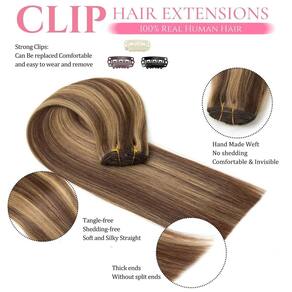Detalhes das extensões de cabelo humano com clipe: Tipo de cabelo humano: clipe em extensões de cabelo humano real. Materiais de extensões de cabelo com clipe: 100% cabelo humano Remy. Comprimento: 35,5 cm, 40,6 cm, 45,7 cm, 50,8 cm, 56 cm, 61 cm disponíveis. Peso: 35.6 cm-90g, 40.6 cm-100g, 45.7 cm-100g, 50.8 cm-105g, 55.9 cm-110g, 61.0 cm-120g. Textura do cabelo humano: liso - ?Extensões de cabelo com clipe no material de cabelo humano real?: nossas extensões de cabelo liso são feitas de 100% cabelo humano virgem remy não processado. Nossas extensões de cabelo humano real com clipe são limpas/macias/saudáveis/sem queda/sem emaranhamento/sem química. O clipe em extensões de cabelo humano real é fácil de ser tingido/enrolado/reestilizado. Escolhemos cabelos de alta qualidade, tão bons quanto o seu próprio cabelo. - ?Grampo de cabelo humano em extensões?: extensões de cabelo humano com clipe, 8 peças 90-120 g com 18 clipes por conjunto. O comprimento para extensões de cabelo humano com clipe reto: 35.6 cm-90g, 40.6 cm-100g, 45.7 cm-100g, 50.8 cm-105g, 55.9 cm-110g, 61.0 cm-120g. De acordo com o volume do seu cabelo, geralmente 1-2 pacotes podem preencher toda a sua cabeça, aumentando o comprimento e o volume. Se você tem cabelo grosso, recomendamos comprar mais de 2 pacotes para alcançar um resultado perfeito - ?Vantagem das extensões de cabelo humano?: penteie facilmente, lave facilmente e cuide facilmente. Você pode usar facilmente e remover os clipes sozinho para mudar o penteado para diferentes ocasiões. Ao contrário das extensões de cabelo tradicionais com clipe reto, as extensões de cabelo sem fita não têm cola, não danificam o couro cabeludo e o cabelo, podem se misturar perfeitamente com a cor do seu cabelo. - ?Dicas de cuidados com extensões de cabelo com encaixe?: esfregue seu cabelo suavemente enquanto o lava. É necessário um pouco de xampu suave e condicionador de cabelo, depois lave com água morna e deixe secar naturalmente. Antes e depois do uso, lembre-se de escovar suas extensões de cabelo suavemente com uma escova de cerdas macias. - ?Serviço pós-venda e dicas de cores?: se você não ficar satisfeito com o produto de extensões de cabelo com clipe, por e-mail, faremos o nosso melhor para ajudá-lo a resolver o problema do produto rapidamente! As cores semelhantes à imagem real podem diferir ligeiramente das cores exibidas devido à iluminação, exibição e configurações