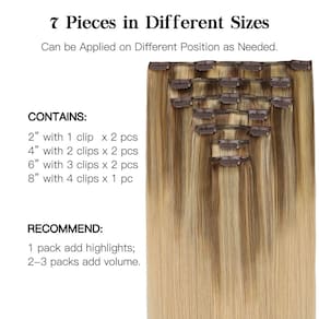 - Disponível em e tamanhos. -- Nossas extensões de cabelo humano com clipe estão disponíveis em um conjunto de 7 peças de 120 g. Disponível em 6 comprimentos de 35,5 a 61 cm. Extensões de cabelo loiro, extensões de cabelo Balayage, uma variedade de cores para satisfazer seus desejos de cor e combinar perfeitamente com o seu cabelo. Você pode usar 1 peça para adicionar um raio de brilho ao seu cabelo, ou você pode usar todos os clipes para deixar seu cabelo mais cheio e mais charmoso.