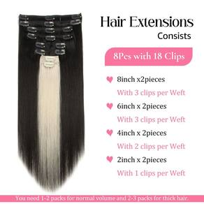 -?Detalhes do clipe de cabelo humano em extensões?: clipe em extensões de cabelo humano, 8 peças de 90-120 g com 18 clipes por conjunto. O comprimento dos clipes retos em extensões de cabelo humano: 14 polegadas-90g, 16 polegadas-100g, 18 polegadas-100g, 20 polegadas-105g, 22 polegadas-110g, 24 polegadas-120g. De acordo com o volume do seu cabelo, geralmente 1-2 pacotes podem encher toda a cabeça, aumentando o comprimento e o volume. Se você tem cabelos grossos, recomendamos comprar mais de 2 pacotes para obter um resultado perfeito