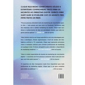 Anúncios, notícias, redes sociais, fake news, clickbaits: como driblar o excesso de informação e criar conteúdo criativo que chame a atenção e gere engajamento? Em Clique aqui , Alex Schultz, CMO da Meta, um dos nomes mais influentes do marketing digital no mundo, tem as dicas perfeitas para destacar o seu negócio e elevar sua performance à excelência. Quando milhares de pessoas passaram a ter acesso à internet em computadores e celulares, o alto potencial do marketing digital ainda estava prestes a ser desvendado. Em três décadas desde a disseminação da rede móvel, o crescimento de marcas e conglomerados na disputa pela atenção dos usuários aconteceu de maneira rápida e insaciável. Neste cenário, uma questão se tornou essencial: como se destacar no agora imenso mercado do marketing digital? Um dos responsáveis pelo sucesso mundial de redes como o Facebook, WhatsApp e Instagram, Alex Schultz é CMO da Meta, além de consultor de outras grandes empresas do Vale do Silício e start-ups. Em Clique aqui , o executivo divide com o leitor conceitos essenciais para todo profissional de marketing, além de fornecer conselhos acerca de contratação de colaboradores, identificação de canais de venda e muito mais. Um guia acessível, Clique aqui é uma aula de marketing digital com um dos maiores especialistas da área. Este manual vai ensiná-lo a sair do senso comum, criar uma cultura de paixão pela criatividade e gerar resultados de alto nível, quer você seja um pequeno empresário, trabalhe em uma empresa em crescimento ou em uma multinacional, mostrando como alcançar o sucesso em qualquer cenário e fazer a diferença. “Poucas pessoas entendem tanto de marketing de crescimento quanto Alex — tudo graças aos seus anos no Facebook, facilmente uma das empresas com o melhor marketing no mundo. Clique aqui condensa o conhecimento de Alex em estratégias simples que todo negócio precisa aplicar.” - Daniel Ek, CEO do Spotify