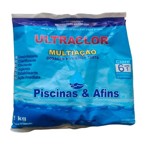 O Cloro Ultraclor Multiação 6 Em 1 - 1Kg foi especialmente desenvolvido e pensando em gerar o melhor resultado e custo benefício para a sua piscina. O Cloro para piscina apresenta ação imediata, estabilizadora, clarificante, oxidante, elimina matéria orgânica e combate agentes infecciosos, atuando como desinfetante para piscinas. É orgânico estabilizado, granulado, excelente agente oxidante e sanitizante. Sua elevada concentração associada à estabilização proporciona excelente rendimento em menores dosagens. Ideal para piscinas de Vinil - Fibra - Azulejo.