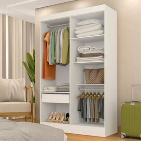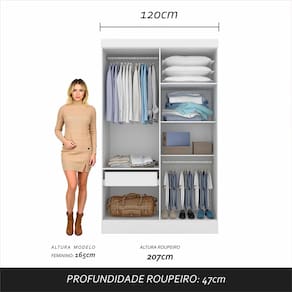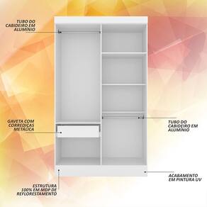 Descrição do Produto - MDP 12mm e 15mm - Acabamento em Pintura UV - Tonalidade: Branco - Cabideiros: Em Alumínio - Gaveta com Corrediça Metálica - Prateleiras suportam até 5kg distribuídos - Gaveta suporta até 5kg distribuídos OBS: Não possui portas