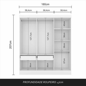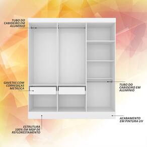 Descrição do Produto - MDP 12mm e 15mm - Acabamento em Pintura UV - Tonalidade: Branco - Cabideiros: Em Alumínio - Gavetas com Corrediças Metálicas - Prateleiras suportam até 5kg distribuídos - Gavetas suportam até 5kg distribuídos OBS: Não possui portas