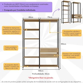 Conteúdo da Embalagem: 1 (um) Módulo com Prateleiras 62cm 1 (um) Módulo com Gavetas e Cabideiro 73cm Manual de Montagem Kit Ferragem