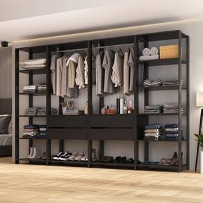 Amplo espaço interno e elegância: O closet é equipado com 14 prateleiras espaçosas (suportam até 8kg em cada), ideais para acomodar suas roupas e calçados favoritos com estilo e organização inigualáveis. Os cabideiros de madeira revestidos garantem que suas roupas, sejam longas ou curtas, fiquem sempre impecáveis. Além disso, com 4 gavetas que possuem corrediças metálicas, o manuseio dos seus pertences ganha leveza e praticidade. Valorize cada peça do seu vestuário com um design aberto e moderno que realça qualquer espaço.