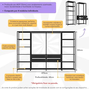 Conteúdo da Embalagem: 2 (dois) Módulos com Prateleiras 62cm 2 (dois) Módulos com Gavetas e Cabideiro 73cm Manual de Montagem Kit Ferragem