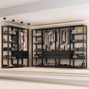 Amplo espaço interno e elegância: O closet é equipado com 21 prateleiras espaçosas (suportam até 8kg em cada), ideais para acomodar suas roupas e calçados favoritos com estilo e organização inigualáveis. Os cabideiros de madeira revestidos garantem que suas roupas, sejam longas ou curtas, fiquem sempre impecáveis. Além disso, com 6 gavetas que possuem corrediças metálicas, o manuseio dos seus pertences ganha leveza e praticidade. Valorize cada peça do seu vestuário com um design aberto e moderno que realça qualquer espaço.