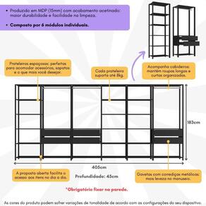 Especificações Técnicas: Dimensões do Produto Montado - Altura: 183cm | Largura: 405cm | Profundidade: 45cm Material: MDP 15mm Acabamento: Acetinado Quantidade de Prateleiras: 21 Quantidade de Gavetas: 6 Corrediças: Metálicas