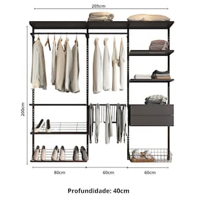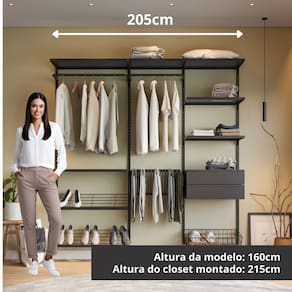 Transforme espaços compactos em ambientes organizados e modernos com o Closet Modular da Closet Home. Ideal para quem mora em apartamento ou precisa aproveitar melhor o quarto sem investir em móveis planejados caros, ele é a solução prática e acessível. O design aberto e ventilado evita mofo e mau cheiro, enquanto a estrutura metálica com pintura epóxi suporta até 35kg por prateleira e dispensa preocupação com cupins. Com layout modular, é possível adaptar, expandir ou reorganizar conforme sua rotina. A montagem é simples, com manual ilustrado e vídeo tutorial. O visual leve combina com qualquer estilo de decoração — e o melhor: com garantia vitalícia, você compra uma vez só. Acabamento da Gaveta: BP Acabamento da Prateleira: BP Ambiente Principal: Quarto codigo_ean: 7900288358462 Complexidade da Montagem: Média: pode ser montado por mais de uma pessoa e/ou necessite de maior conhecimento para montagem Composição: 80% Aço e 20% MDF Cor: Preto Cor do Produto: Preto Cor Interna: Preto Escala de Brilho: Semi-Brilho Gaveta com Chave: Não Itens Inclusos: 1 Closet Modulado, Manual de Montagem e Kit Ferragem Linha ou Coleção: Eminence Manual de Montagem e Instalação: https://product-hub-prd.madeiramadeira.com.br/478107413/documents/0d2bab7a-0a79-4a6c-a6d1-1b10570fcde33343595671217659056276819.pdf Marca: Closet Home Material da Gaveta: MDP Material da Prateleira: MDF Material Principal: Aço Módulo Individual: Sim Montagem Flex: Sim, pode ser alterado 100% o layout Necessita Montagem: Sim Origem do Produto: Nacional Peso: 50 kg Peso Máximo por Gaveta: 10 kg Peso Máximo por Prateleira: 30 kg Possui Cabideiros: 02 Possui Calceiros: 01 Possui Espelho: Não Possui Possui Pés: Suspenso Possui Portas: Não Possui Prateleiras: 06 Recomendações de Uso, Manutenção e Limpeza: Limpe regularmente com pano macio umedecido com sabão neutro e seque em seguida com pano seco;Não utilize esponjas ásperas ou produtos químicos abrasivos. Sistema de Montagem: Cavilhas, Minifix, Prafusos e Buchas Suporta Até (kg): 390 kg Tipo de Corrediça da Gaveta: Metálica Telescópica Tipo de Puxador da Gaveta: Não Possui - Abertura por Fecho Toque Marca: Não Informado