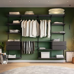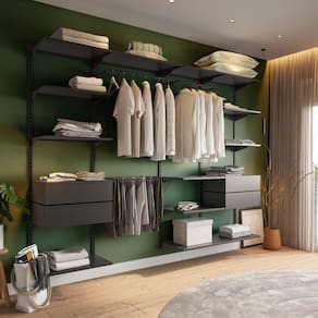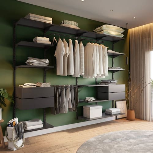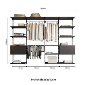 Transforme espaços compactos em ambientes organizados e modernos com o Closet Modular da Closet Home. Ideal para quem mora em apartamento ou precisa aproveitar melhor o quarto sem investir em móveis planejados caros, ele é a solução prática e acessível. O design aberto e ventilado evita mofo e mau cheiro, enquanto a estrutura metálica com pintura epóxi suporta até 35kg por prateleira e dispensa preocupação com cupins. Com layout modular, é possível adaptar, expandir ou reorganizar conforme sua rotina. A montagem é simples, com manual ilustrado e vídeo tutorial. O visual leve combina com qualquer estilo de decoração — e o melhor: com garantia vitalícia, você compra uma vez só. Acabamento da Gaveta: BP Acabamento da Prateleira: BP Ambiente Principal: Quarto codigo_ean: 7900288358622 Complexidade da Montagem: Média: pode ser montado por mais de uma pessoa e/ou necessite de maior conhecimento para montagem Composição: 80% Aço e 20% MDF Cor: Preto Cor do Produto: Preto Cor Interna: Preto Escala de Brilho: Semi-Brilho Gaveta com Chave: Não Itens Inclusos: 1 Closet Modular, Manual de Instalação e Kit Ferragem Linha ou Coleção: Eternity Manual de Montagem e Instalação: https://product-hub-prd.madeiramadeira.com.br/956181732/documents/1eea2f05-d573-431f-8756-867a662281333343596671217659056592857.pdf Marca: Closet Home Material da Gaveta: MDP Material da Prateleira: MDF Material Principal: Aço Módulo Individual: Sim Montagem Flex: Sim, pode ser alterado 100% o layout Necessita Montagem: Sim Origem do Produto: Nacional Peso: 93 kg Peso Máximo por Gaveta: 10 kg Peso Máximo por Prateleira: 35 kg Possui Cabideiros: 02 Possui Calceiros: Não Possui Espelho: Não Possui Possui Pés: Suspenso Possui Portas: Não Possui Prateleiras: 06 Recomendações de Uso, Manutenção e Limpeza: Limpe regularmente com pano macio umedecido com sabão neutro e seque em seguida com pano seco; Não utilize esponjas ásperas ou produtos químicos abrasivos. Sistema de Montagem: Cavilhas, Minifix, Prafusos e Buchas Suporta Até (kg): 510 kg Tipo de Corrediça da Gaveta: Metálica Telescópica Tipo de Puxador da Gaveta: Não Possui - Abertura por Fecho Toque Marca: Não Informado