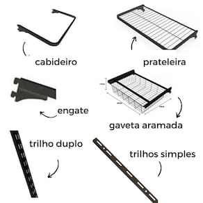 Este produto possui uma configuração casal, contendo cabideiro com dois níveis interrompidos por prateleiras. As gavetas aramadas possuem um fechamento com tampo em mdf.  Você poderá brincar com as peças intercambiando entre módulos ou mudando a altura da peças.