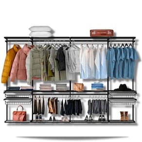 Este produto possui uma configuração casal, contendo cabideiro com dois níveis interrompidos por prateleiras. As gavetas aramadas possuem um fechamento com tampo em mdf. Você poderá brincar com as peças intercambiando entre módulos ou mudando a altura da peças.