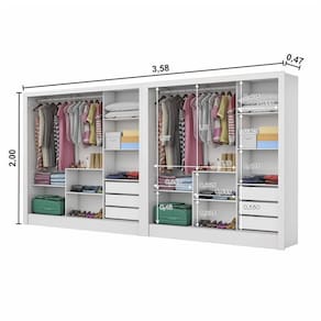 Closet Casal Duplo Fortaleza 6 Portas 12 Prateleiras Branco Closet Casal Duplo Fortaleza com 6 portas e 12 Prateleiras, 2,00m de altura, 1,79m de largura e 0,47m de profundidade, combinado com 12 prateleiras e 2 cabideiros, alem de deixar o produto lindo e funcional, proporciona ao cliente acomodar suas roupas de forma organizada. As roldanas em aco e o trilho em aluminio potencializam o deslizar das portas. Cabideiro com 1,11m em aluminio. Ideal para pendurar pares de blusas, camisas, vestidos, acessorios, entre outros. As pratileiras e o lugar o ideal para colocar roupas de cama e de banho, perfumes, kits de maquiagem, caixinhas com acesorios e bolsas menores. As sapateiras tem o espaco ideal para guardar desde mala de viagem, ate colecoes de sapatos, tenis, ou outros acessorios. Estrutura em MDP. As dimensoes apresentadas referem-se a um modulo, sendo importante destacar que o Closet Casal Duplo Fortaleza com 6 portas e 12 Prateleiras consiste em 2 modulos em um unico produto. Ele pode ser montado em L, de forma linear ou em paredes distintas, adaptando-se perfeitamente ao seu espaco.