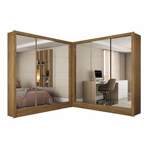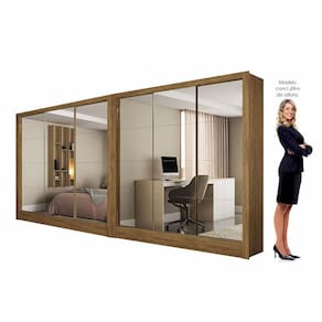 Closet Casal Duplo Fortaleza 6 Portas Premium 12 Prateleiras Cinamomo Descricao e caracteristicas gerais O Closet Casal Duplo Fortaleza e a escolha ideal para quem busca funcionalidade e elegancia no ambiente. Com 6 portas deslizantes, 12 prateleiras internas e 12 espelhos aplicados, ele combina beleza e praticidade em um so movel. A estrutura em MDP de alta resistencia conta com roldanas em aco e trilhos em aluminio, assegurando o deslizamento suave das portas. Os 2 cabideiros de aluminio com 1,11m sao perfeitos para pendurar blusas, vestidos, camisas e acessorios. Ja as prateleiras e espacos inferiores funcionam como sapateiras, ideais para organizar calcados, malas, roupas de cama e banho. Pode ser montado em L, de forma linear ou em paredes distintas, adaptando-se ao seu espaco com versatilidade. Destaques do produto Closet casal com design moderno e espelhos decorativos Estrutura em MDP resistente 6 portas de correr com roldanas em aco e trilhos em aluminio 12 espelhos aplicados nas portas 12 prateleiras amplas para organizacao 2 cabideiros de aluminio com 1,11m de comprimento Espacos internos funcionam como sapateira Montagem flexivel: em L, linear ou em paredes separadas