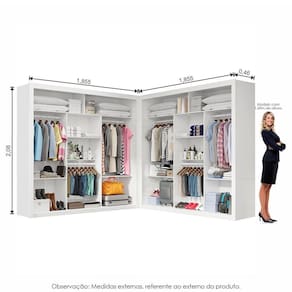 Closet Casal Clarice 2,08m de altura, 1,855m de largura e 0,46m de profundidade, combinado com 8 prateleiras e 6 cabideiros, deixa o produto com uma divisão funcional capaz de proporcionar ao cliente acomodar todas as suas roupas de maneira mais organizada e com maior visibilidade. Nos maleiros cabem edredons, cobertores, travesseiros, malas, toalhas, bolsas, entre outros.