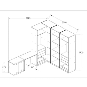 Dimensões: Mesa Escrivaninha: 77,5 x 100 x 50 cm Sapateira: 77,5 x 79,22 x 50,20 cm Closet módulo canto: 240 x 135 x 85 cm Closet módulo maior: 240 x 159 x 56 cm