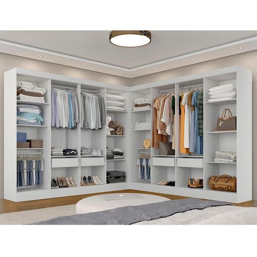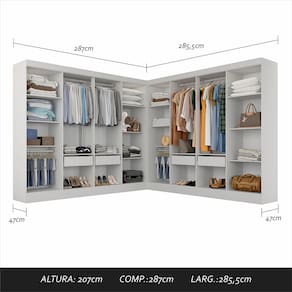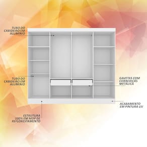 Descrição do Produto - MDP 12mm e 15mm - Acabamento em Pintura UV - Tonalidade: Branco - Cabideiros: Em Alumínio - Gavetas com Corrediças Metálica - Prateleiras suportam até 5kg distribuídos - Gaveta suporta até 5kg distribuídos OBS: NÃO possui portas