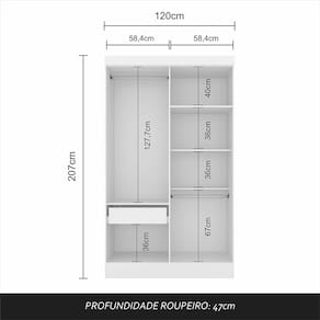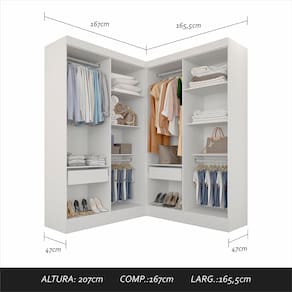 Descrição do Produto - MDP 12mm e 15mm - Acabamento em Pintura UV - Tonalidade: Branco - Cabideiros: Em Alumínio - Gavetas com Corrediças Metálica - Prateleiras suportam até 5kg distribuídos - Gaveta suporta até 5kg distribuídos OBS: NÃO possui portas