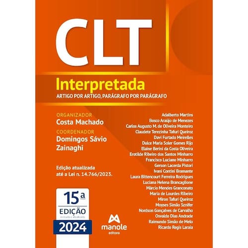 CLT interpretada artigo por artigo, parágrafo por parágrafo, agora em 15 edição, sob a organização do Professor Costa Machado e coordenação do Professor Domingos Sávio Zainaghi, faz parte da bem-sucedida linha de Códigos interpretados em formato reduzido da Editora Manole. Trata-se de obra didática, completa e fácil de manusear. Didática porque, sendo a maioria de seus autores professores de Direito do Trabalho e/ou Direito Processual do Trabalho, incluindo o coordenador, a preocupação pedagógica é uma constante, o que torna a obra um sucedâneo dos manuais existentes nas livrarias jurídicas. Completa porque corresponde ao único trabalho disponível no mercado que realmente apresenta interpretações artigo por artigo, parágrafo por parágrafo da CLT. Fácil de manusear e transportar por conta do seu formato reduzido, que permite ao aluno levar todos os dias a sua CLT interpretada para a faculdade e ao profissional levá-la para o fórum e suas audiências.