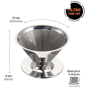 Coador Inox Reutilizável Tamanho 101 - Não Precisa de PapelJá ficou chateado quando seu filtro de papel acabava e te impedia de fazer aquele cafezinho Ou você que não abre mão do sabor espetacular da prensa francesa Então o coador de Inox vai te surpreender, fácil de preparar, de limpar, prático para você carregar e guardar em sua casa por não ocupar bastante espaço, além de trazer economia para seu bolso, pois não usa filtro de papel e contribui para o meio ambiente. A tela que compõe o coador é adequada para a utilização de uma moagem média do café, que é a mesma para os filtros de papel convencionais. Por ser bastante fina, o café não fica com nenhum resquício de pó na bebida. Uma de suas vantagens é ser constituída de Aço Inox, o que a torna resistente além de não enferrujar. Instruções para um café perfeito:Para obter melhores resultados, o tempo de preparo deve ser de aproximadamente 3 minutos. A passagem da água pelo pó de café de maneira uniforme resulta em uma bebida mais suave, com doçura e acidez acentuadas adequadamente. A moagem do café deve ser média ou fina e a quantidade ideal de pó é entre 65g a 75g para 900 ml de água, quantidade suficiente para 6 xícaras de café. Vantagens:- Suporte permanente para passar café em Aço Inox pequeno para preparo do café coado.- Deixa a bebida com gosto mais suave, deixando o café mais saboroso- Super Prático e Fácil de Usar e Limpar. Não precisa de Filtro de Papel- Lindo Design, item perfeito para os apaixonados por caféPeso- 0,105gAltura- 7cmLargura- 11cmComprimento- 11cm