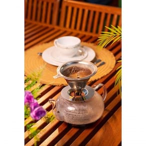 - Filtro de café reutilizável feito de aço inoxidável e camada dupla.