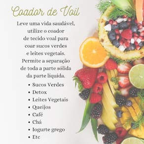 Coador De Voal Voil Para Leites Vegetais Sucos Verdes Kefir Coador de Voil Contém: 01 Unidade Cor: Branco Tamanho Médio / 100% Poliéster Dimensão: 50cm de diâmetro x 25cm de altura Durável, reutilizável e lavável Modo de lavar: Lavar à mão, não alvejar, não centrifugar e não passar. Leve uma vida saudável, utilize o coador de tecido voal para coar sucos verdes e leites vegetais. Permite a separação de toda a parte sólida da parte líquida. Nossos coadores são confeccionados artesanalmente. Podem ser em: Sucos Verdes / Detox Leites Vegetais Queijos Coalhada Seca Iogurte Grego Kefir Café Etc. Marca: Não Informado