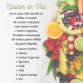 Coador De Voal Voil Para Leites Vegetais Sucos Verdes Kefir Coador de Voil Contém: 01 Unidade Cor: Branco Tamanho Médio / 100% Poliéster Dimensão: 50cm de diâmetro x 25cm de altura Durável, reutilizável e lavável Modo de lavar: Lavar à mão, não alvejar, não centrifugar e não passar. Leve uma vida saudável, utilize o coador de tecido voal para coar sucos verdes e leites vegetais. Permite a separação de toda a parte sólida da parte líquida. Nossos coadores são confeccionados artesanalmente. Podem ser em: Sucos Verdes / Detox Leites Vegetais Queijos Coalhada Seca Iogurte Grego Kefir Café Etc. Marca: Não Informado