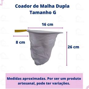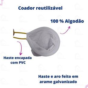 - coador reutilizável; - confeccionado em algodão 100%; - malha dupla; - haste e aro confeccionados em arame galvanizado; - comprimento do cabo: 8 centímetros padrão para todos os tamanhos - altura do coador: pp 13 cm , p 18 cm , m 22 cm , g 26 cm e gg 32 cm ; - largura do coador: pp 10 cm ; p 12 cm , m 14 cm , g 16 cm e gg 18 cm .