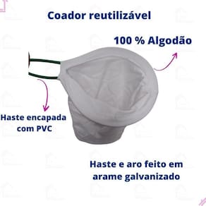 - coador reutilizável; - confeccionado em algodão 100%; - malha dupla; - haste e aro confeccionados em arame galvanizado; - comprimento do cabo: 8 centímetros padrão para todos os tamanhos - altura do coador: pp 13 cm , p 18 cm , m 22 cm , g 26 cm e gg 32 cm ; - largura do coador: pp 10 cm ; p 12 cm , m 14 cm , g 16 cm e gg 18 cm .