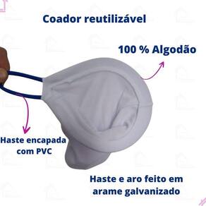 - coador reutilizável; - confeccionado em algodão 100%; - malha dupla; - haste e aro confeccionados em arame galvanizado; - comprimento do cabo: 8 centímetros padrão para todos os tamanhos - altura do coador: pp 13 cm , p 18 cm , m 22 cm , g 26 cm e gg 32 cm ; - largura do coador: pp 10 cm ; p 12 cm , m 14 cm , g 16 cm e gg 18 cm .
