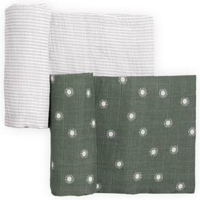 Um conjunto de panos complementares e que pode ser presenteado, feito de algodão orgânico 100% certificado GOTS e certificado OEKO-TEX. Eles são um presente perfeito para o chá de bebê e são essenciais para novos pais! O tecido respirável de musselina o torna ótimo para enfaixar, brincar, amamentar e levar para qualquer lugar.