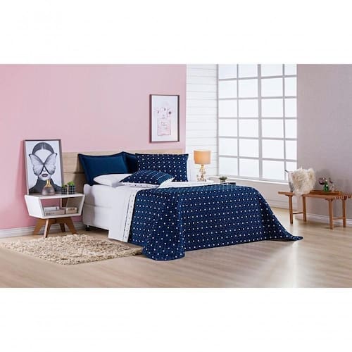 Cobre Leito 200 Fios Petit Poá Queen 03 Peças - Marinho O Cobre leito Petit Poá possui tecido micro percal 200 fios com estampa clássica de bolinha, é totalmente matelado, dupla face, pode ser dos dois lados, acompanha porta travesseiros. Produto composto por: 01 Cobre leito 2,60m x 2,40m02 Porta travesseiros 70cm x 50cm Composição: Tecido: Superior e Inferior 100% PoliésterEnchimento: 100% Poliéster Ean: 7908125129022