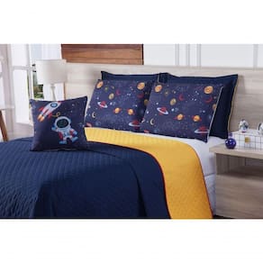 O Kit Cobre leito Astronauta possui estampa do tema, é dupla face, é facil de lavar e secar, vai deixar seu quarto mais aconchegante!