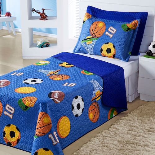 Principais Características: - Colcha solteiro com estampa de futebol - Dupla face, com estampa em ambos os lados - Tamanho ideal para camas de solteiro - Tecido 100% poliéster, resistente e durável - Enchimento em 100% poliéster, macio e confortável - Cor azul vibrante, perfeita para quartos infantis - Conjunto inclui colcha e porta travesseiro