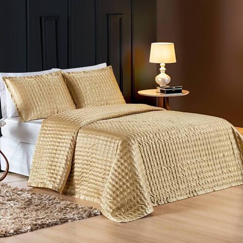 Marca: Bia Enxovais | Estampa: Não se Aplica | Medidas: 01 Cobre Leito 2,60m x 2,40m02 Porta Travesseiros 70cm x 50cm | Número de Peças: 03 Peças | Material: Poliéster | Cor Predominante: Dourado | Cama Indicada: Queen