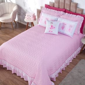 Confira suas Características: - Produto confeccionado em tecido microfibra - Cobre leito e portas travesseiros matelados - Produto forrado com tecido microfibra na cor branca - Detalhes do produto com babado liso e estampado póa de estrelas - Fronha e almofada decorativa com estampa excluvisa digital, com fechamento em zíper - Enchimento somente na almofada - Acabamentos do cobre leito e portas travesseiros em bainha Produto Composto por: 1 Cobre Leito.....2,50M X 2,45M 2 Portas Travesseiros...70Cm X50Cm 2 Fronhas Estampadas...65Cm X 45Cm 1 Capa De Almofada....40Cm X 40Cm 1 Refil De Almofada...40Cm X 40Cm Composicao Tecido 100% Poliester Enchimento 100% Poliester Marca: AQUARELA ENXOVAIS | Estampa: Não se Aplica | Medidas: 1 Cobre Leito.....2,50M X 2,45M2 Portas Travesseiros...70Cm X50Cm2 Fronhas Estampadas...65Cm X 45Cm1 Capa De Almofada....40Cm X 40Cm1 Refil De Almofada...40Cm X 40Cm | Número de Peças: 07 Peças | Material: Poliéster | Cor Predominante: Rosa | Cama Indicada: Queen