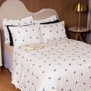 Obrigado por visitar nossa loja, temos os melhores produtos de cama, mesa e banho para sua casa com a melhor qualidade e variedade em diversos modelos, todos são rigorosamente revisados.Contém:01 Cobre leito estampado com 2,55m x 2,45m02 Porta travesseiros estampados com 0,7m x 0,5mComposição:Tecido 150 fios 67% Algodão 33% PoliésterTecido de baixo (forro) 100% poliesterEnchimento: Manta resinada 100% PoliésterIdeal para cama casal queen ou padrão. Forrado em tecido.As fotos são ilustrativas, as cores podem variar de acordo com cada monitor e não representam todas as peças que compõem na foto do produto.Muito obrigada pela sua visita e boas compras.