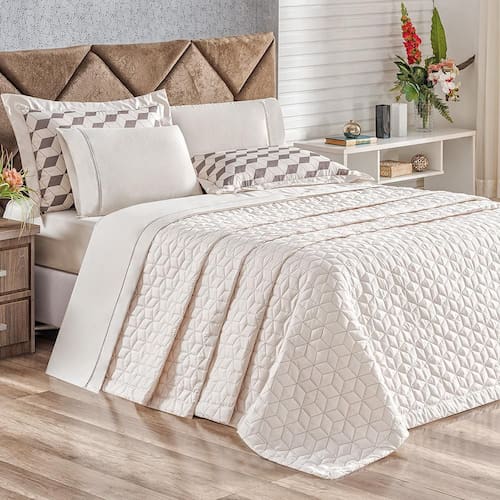Produto composto por: 01 cobre leito 2,60m x 3,10m 02 porta travesseiros estampa digital 70cm x 50cm área útil com aba americana Composição Tecido superior 100% poliéster Manta 100% poliéster Tecido inferior 100% poliéster Ean: 7908565974879