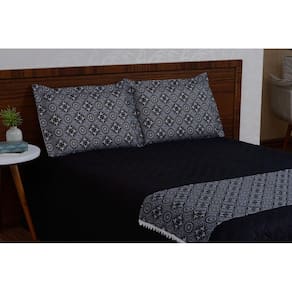 Cobre leito matelado com xale 5 peças preto e lençol queen Cobre leito valencia casal queen 5 peças Contém: 01 cobre leito 2,50m x 2,20m. 02 portas travesseiro 0,70cm x 0,50cm. 01 xale 1,70 x 0,50 01 lençol branco com elástico para cama 1,98m x 1,58m x 0,25cm