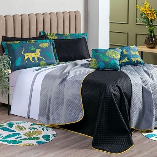 Confira nossa nova Coleção Onça, pensando especialmente na beleza do seu quarto, lançamos em apenas um kit tudo que sua cama precisa para tornar seu ambiente ainda mais lindo e super decorado. Para a praticidade do seu dia-a-dia o Cobre Leito é confeccionado em tecido Microfibra 100% Poliéster, trazendo um toque macio, com portas em acabamento debrum, o cobre leito com enchimento em manta dupla face, permitindo o uso dos dois lados (Preto e Cinza) com lindos detalhes nos porta-travesseiros estampados e nas duas almofadinhas temáticas, tudo perfeito para combinar com a sua decoração! Produzido num rigoroso controle de qualidade, dando um toque de requinte para o ambiente.